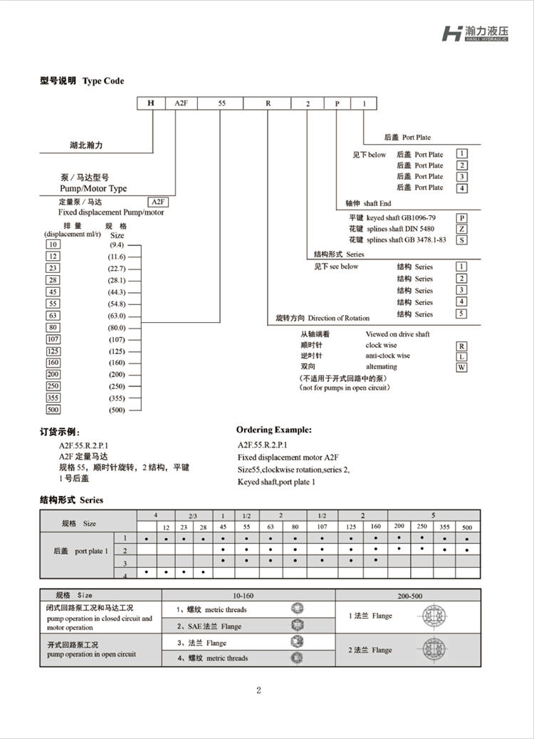 A2F80R2P3型號解析說明:A2F為產品系列類別,即斜軸式軸向柱塞泵;80代表泵的排量為80ml/r;R代表正旋(L為反旋);2為軸申結構,具體參考產品說明書;P為平鍵軸;3代表泵的后蓋結構。
